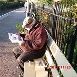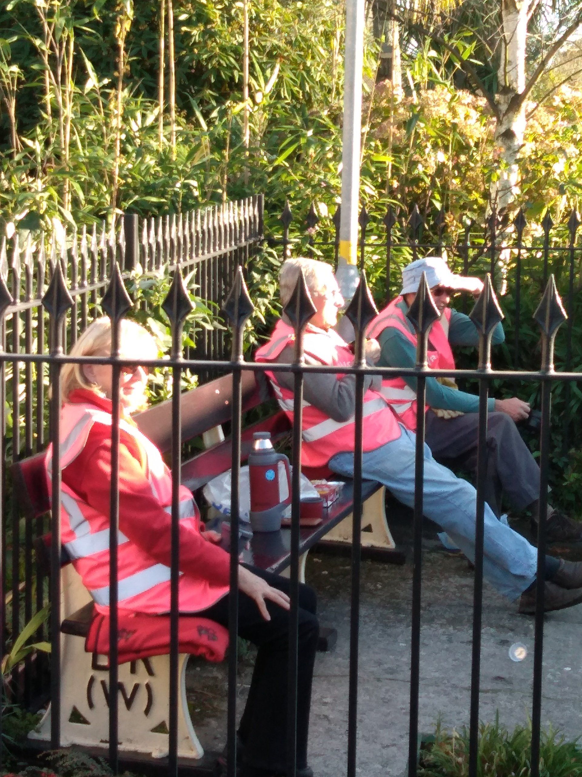 Teatime! Phyllis and the two Dave's take a well earned break and catch a few autumnal rays. Note the original GWR finialled, painted bench.