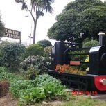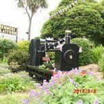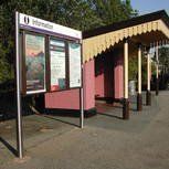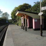 Full sized traction engine "Rio" stands sentinel in the car park. The old timetable and photographs are a tribute to former station staff Leonard Grose and Robert Lamport.