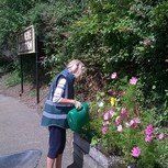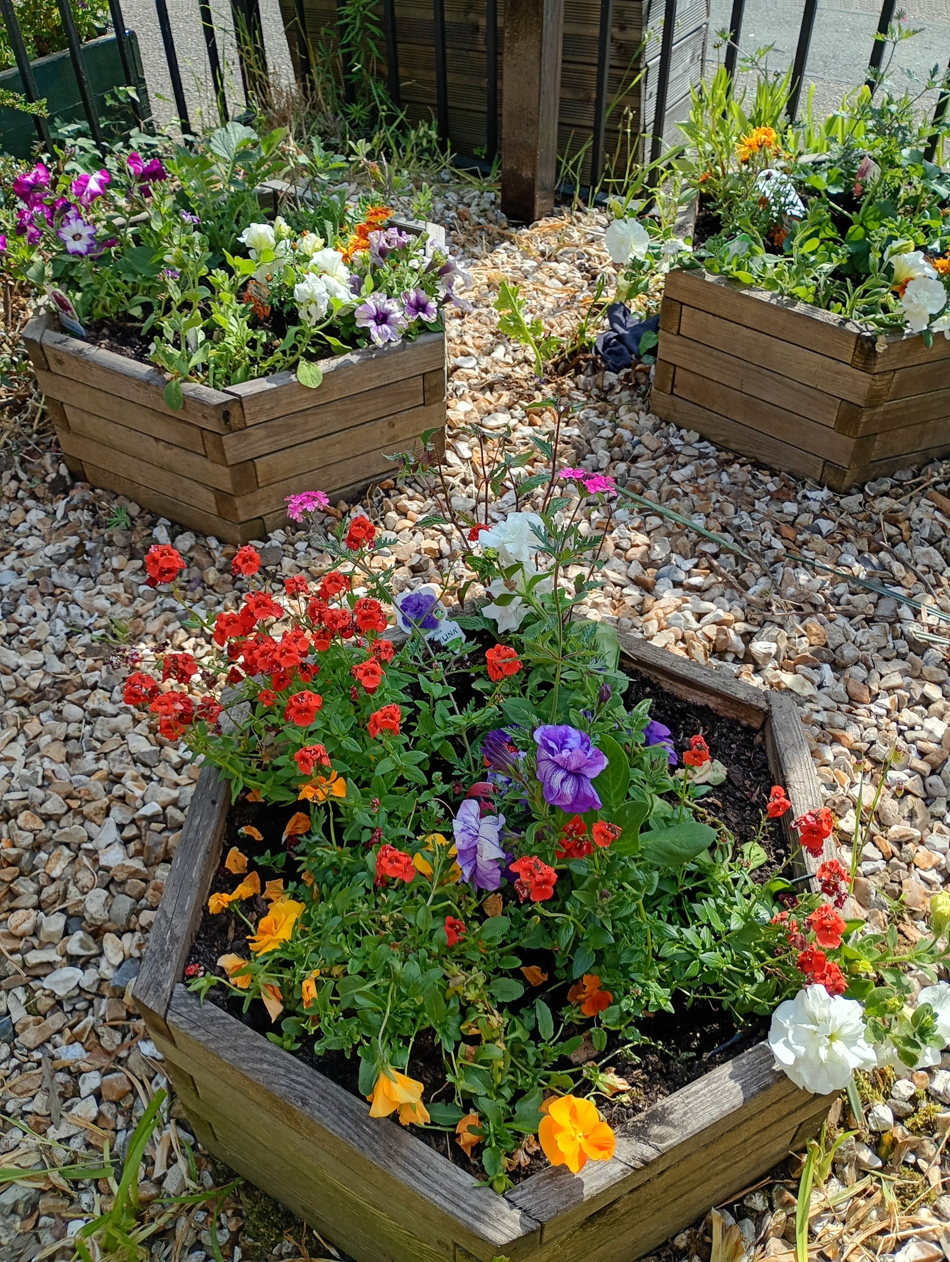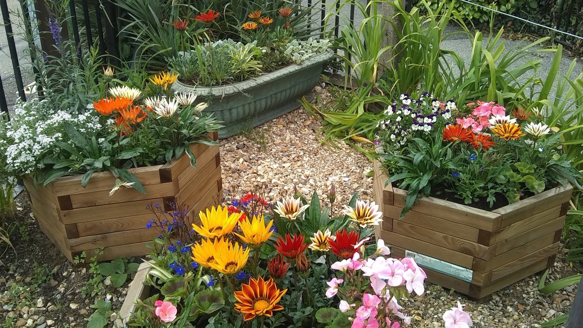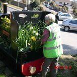 Jan busy planting up tubs on platform in preparation for judging in the RHS "Its your neighbourhood" competetion 2018.