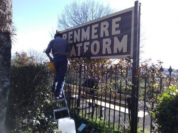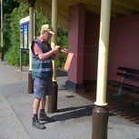 Dave repaints one of the poles in chocolate that holds a Station Totem on the platform.Station refresh traking place, ready for the "Station Centenary of opening".