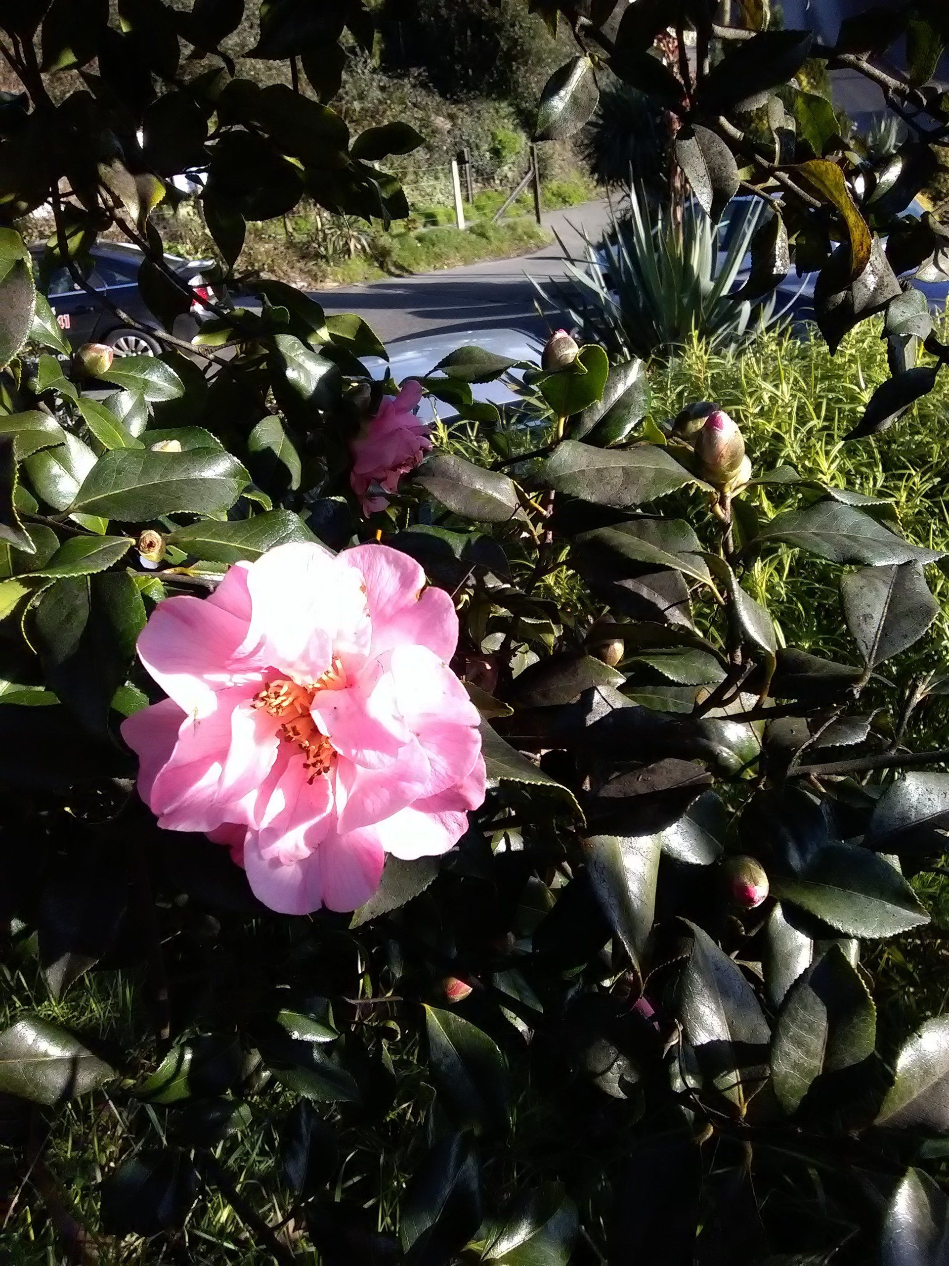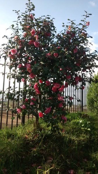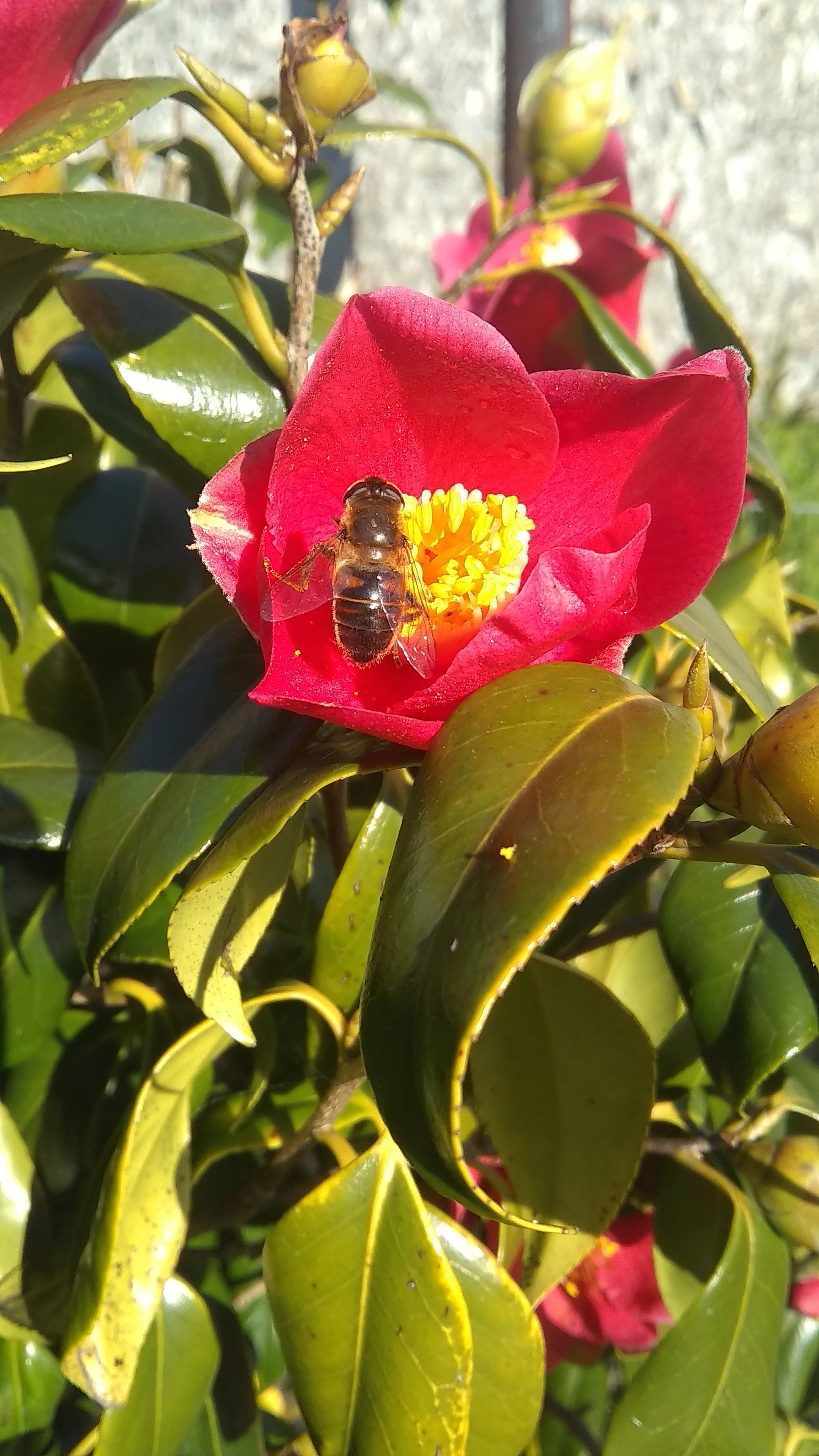 A Camellia brings a splash of colour to the station which a bee finds rather interesting!