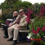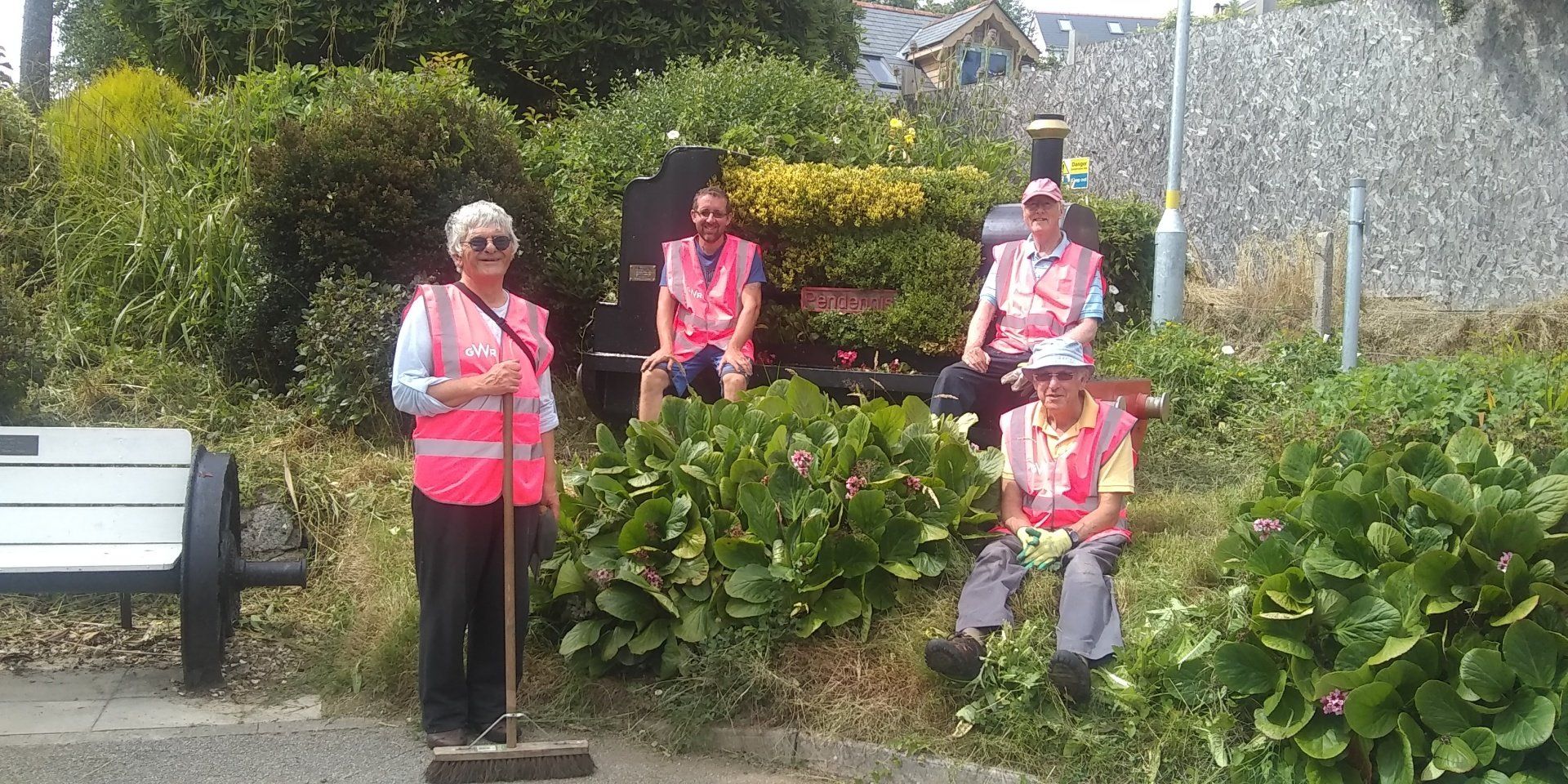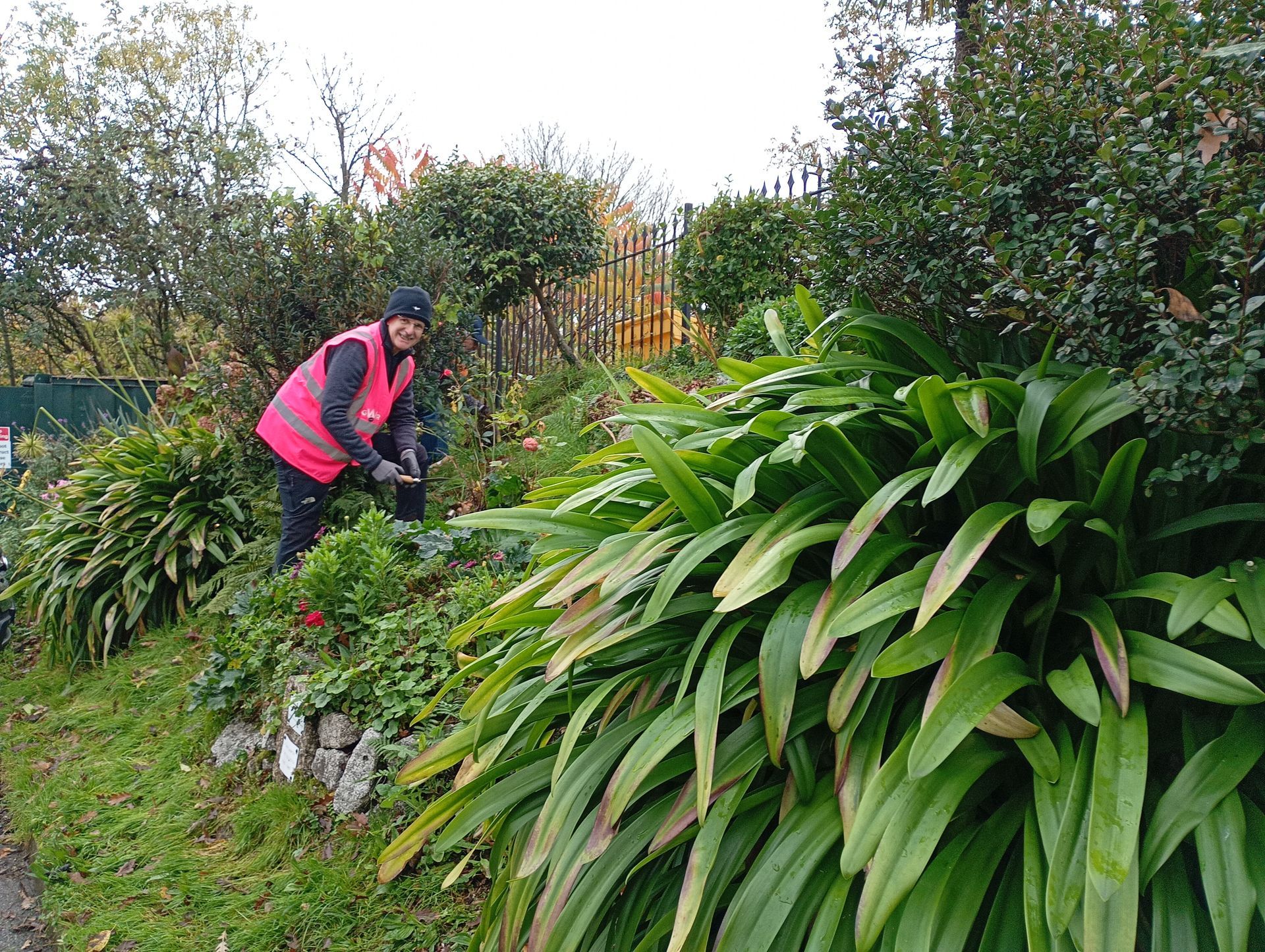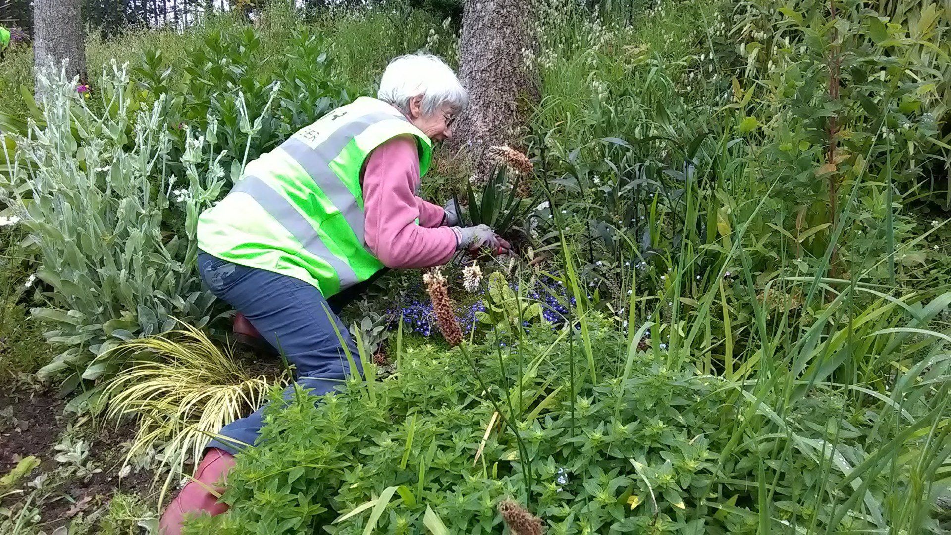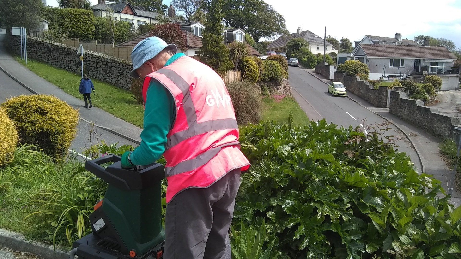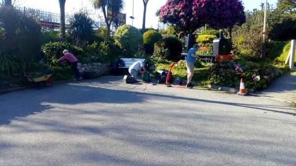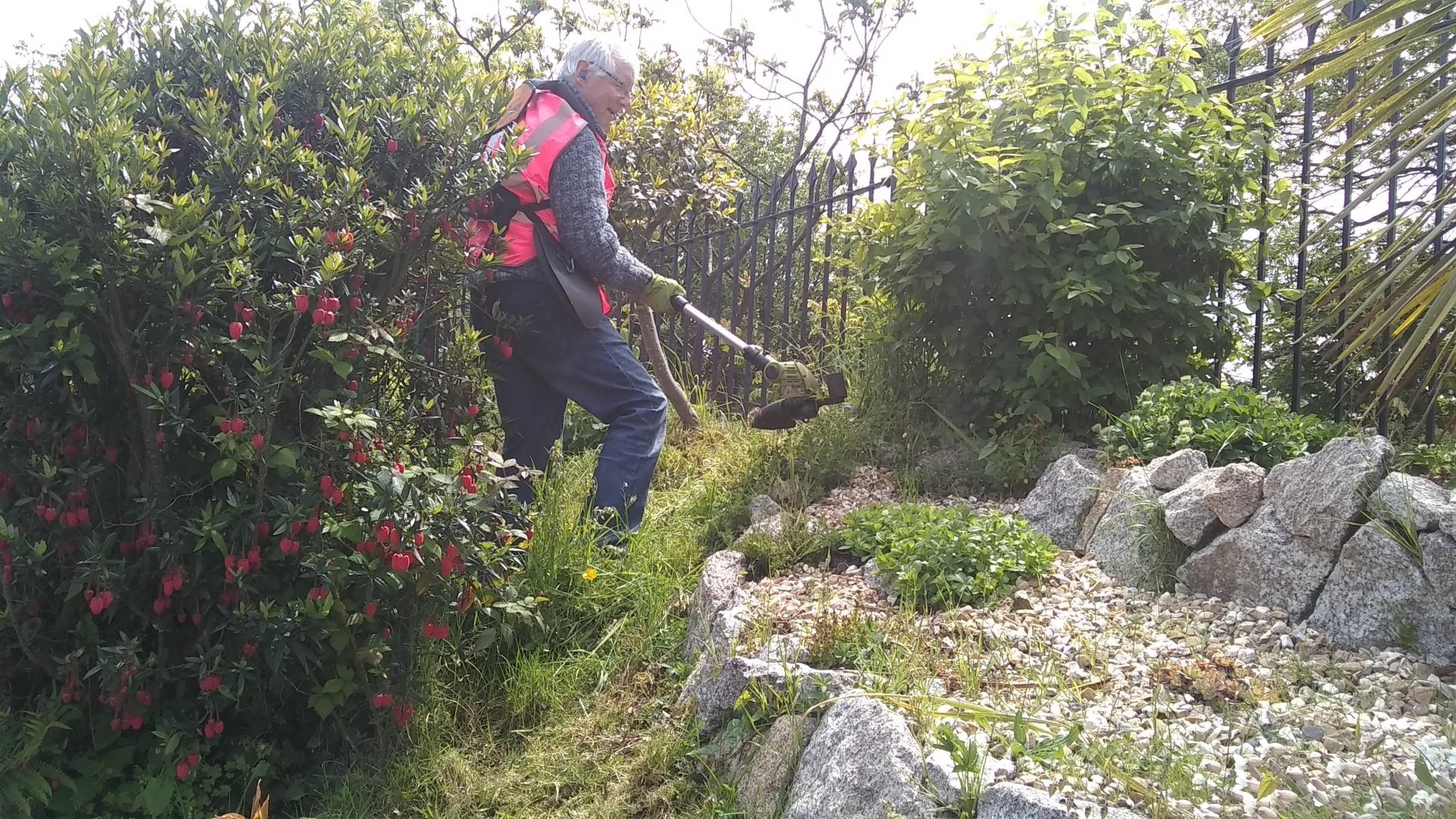 Phyllis gets to grips with trimming the rugby ball flower bed whilst Dan and Jan supervise!