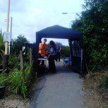Josh, Jan, Brian, Steve Phyllis and John taking a break in the sunshine with cups of tea and cake!
