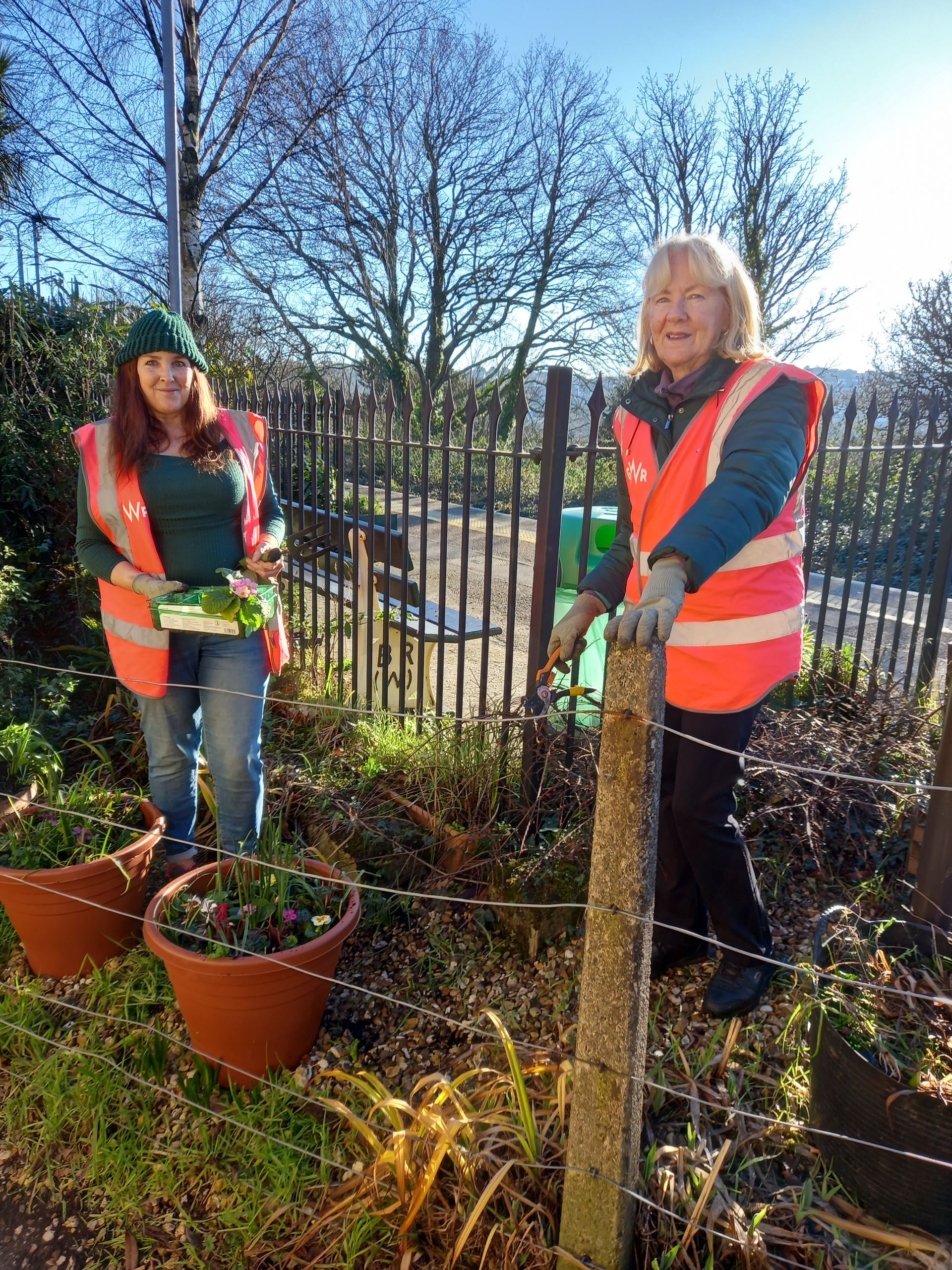 Phyllis and Helen plant up the triangle, our first tidy up of the year.