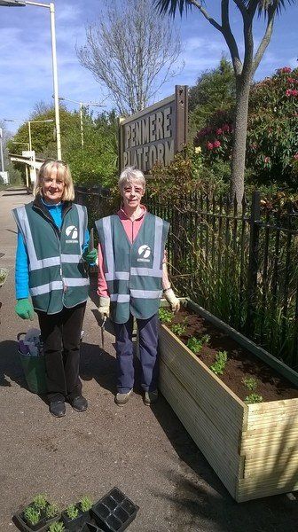 Phyllis and Janet planting up tubs on Falmouth end of platform.