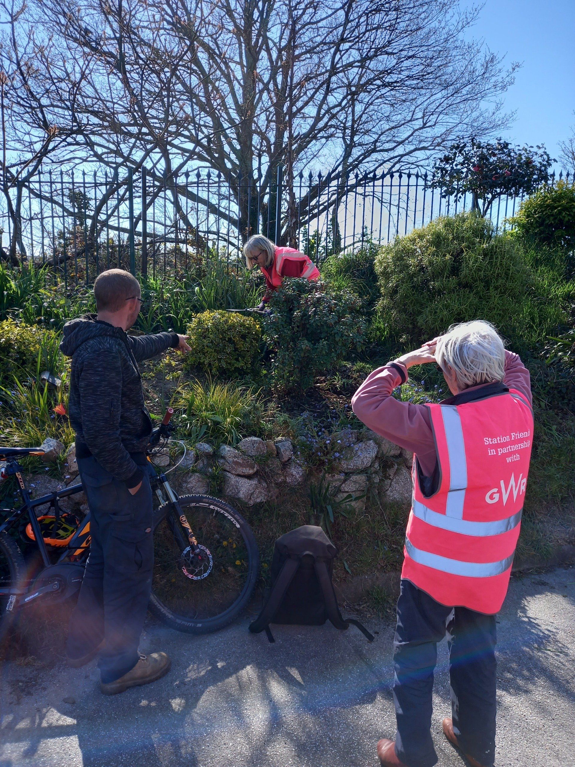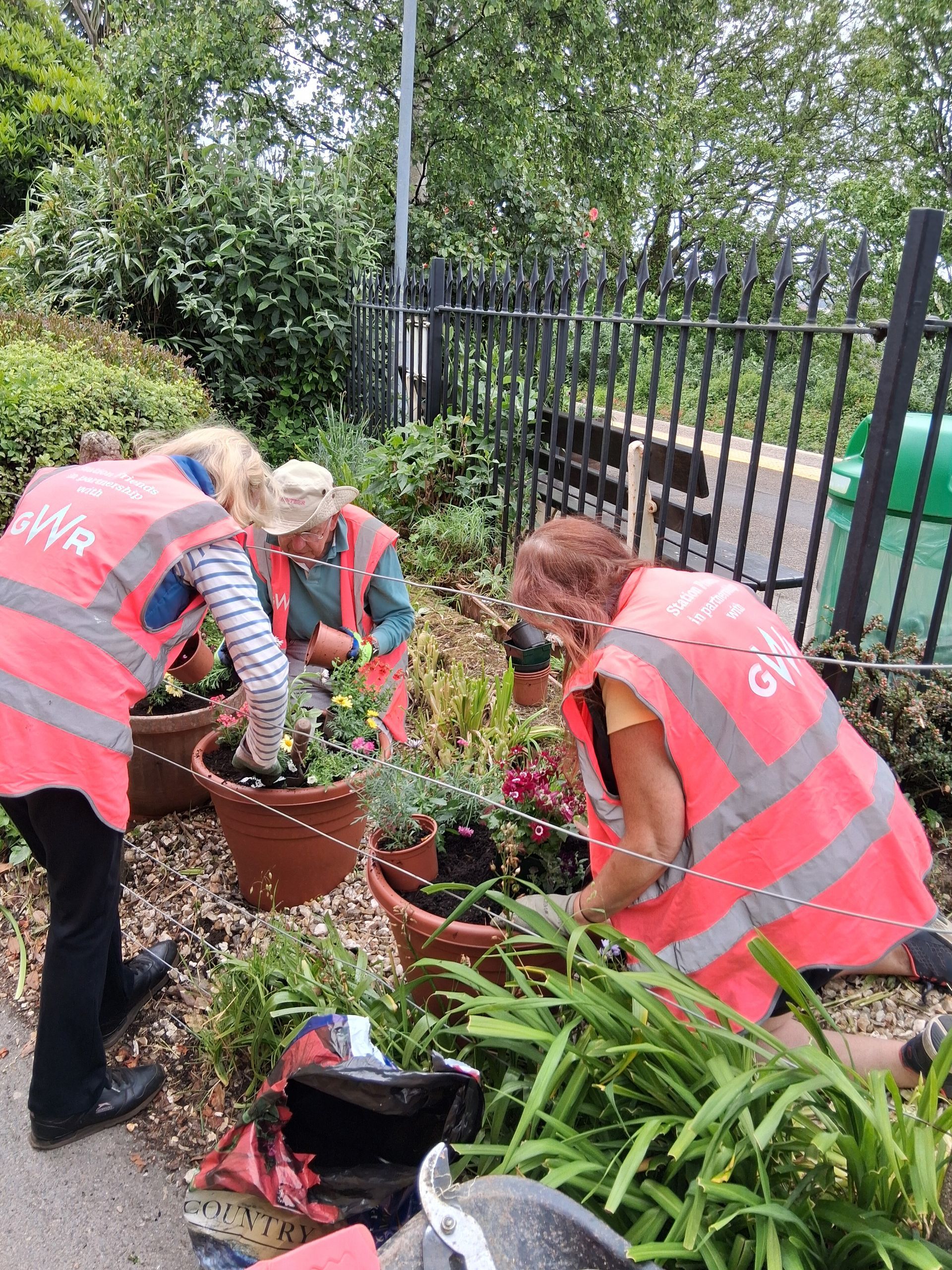 Phyllis, Helen and Dave planting up tubs in the triangle with the donated GWR plants.