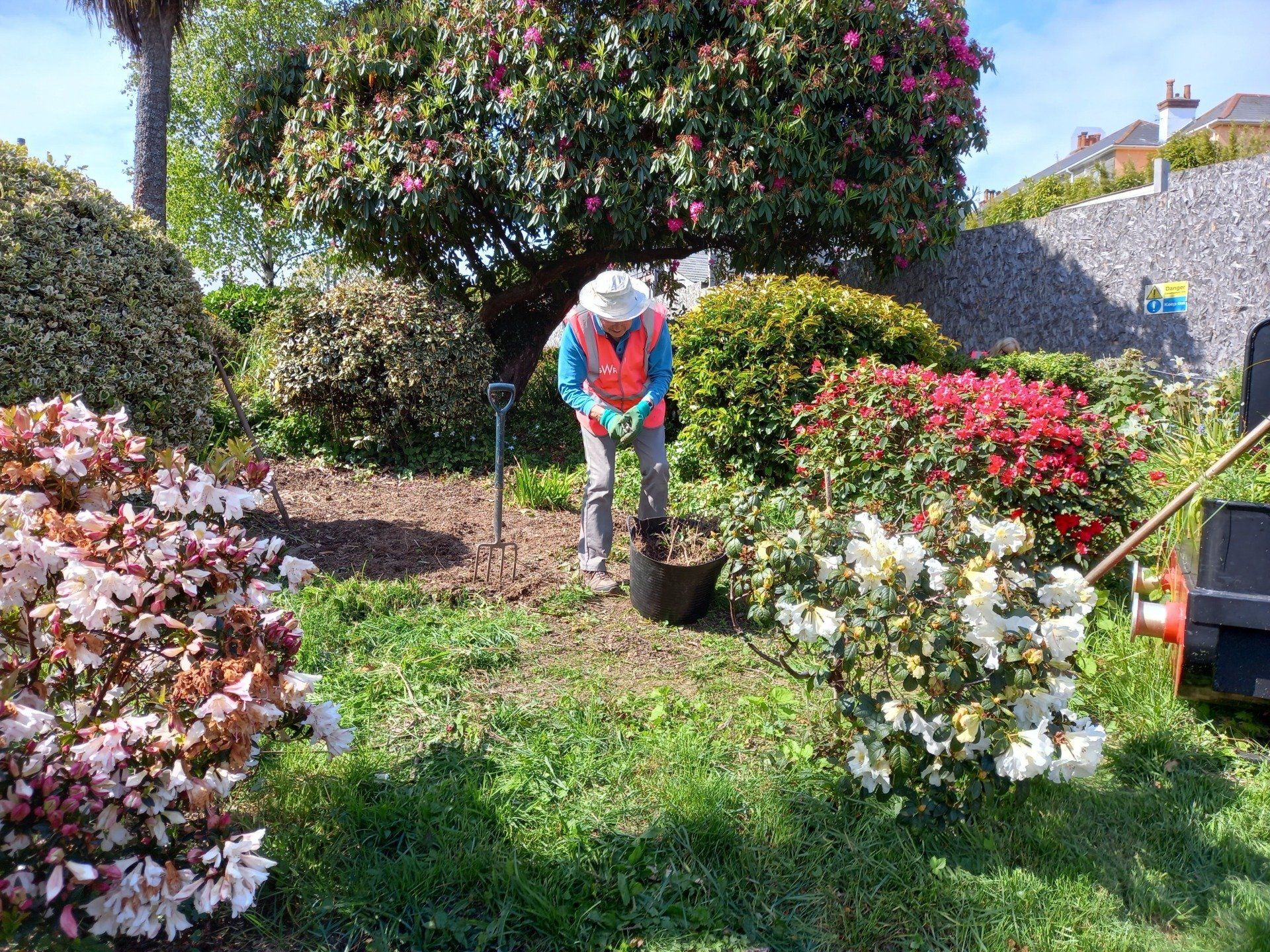 Dave prepares our new wild life flower area among the very colourful azaleas.