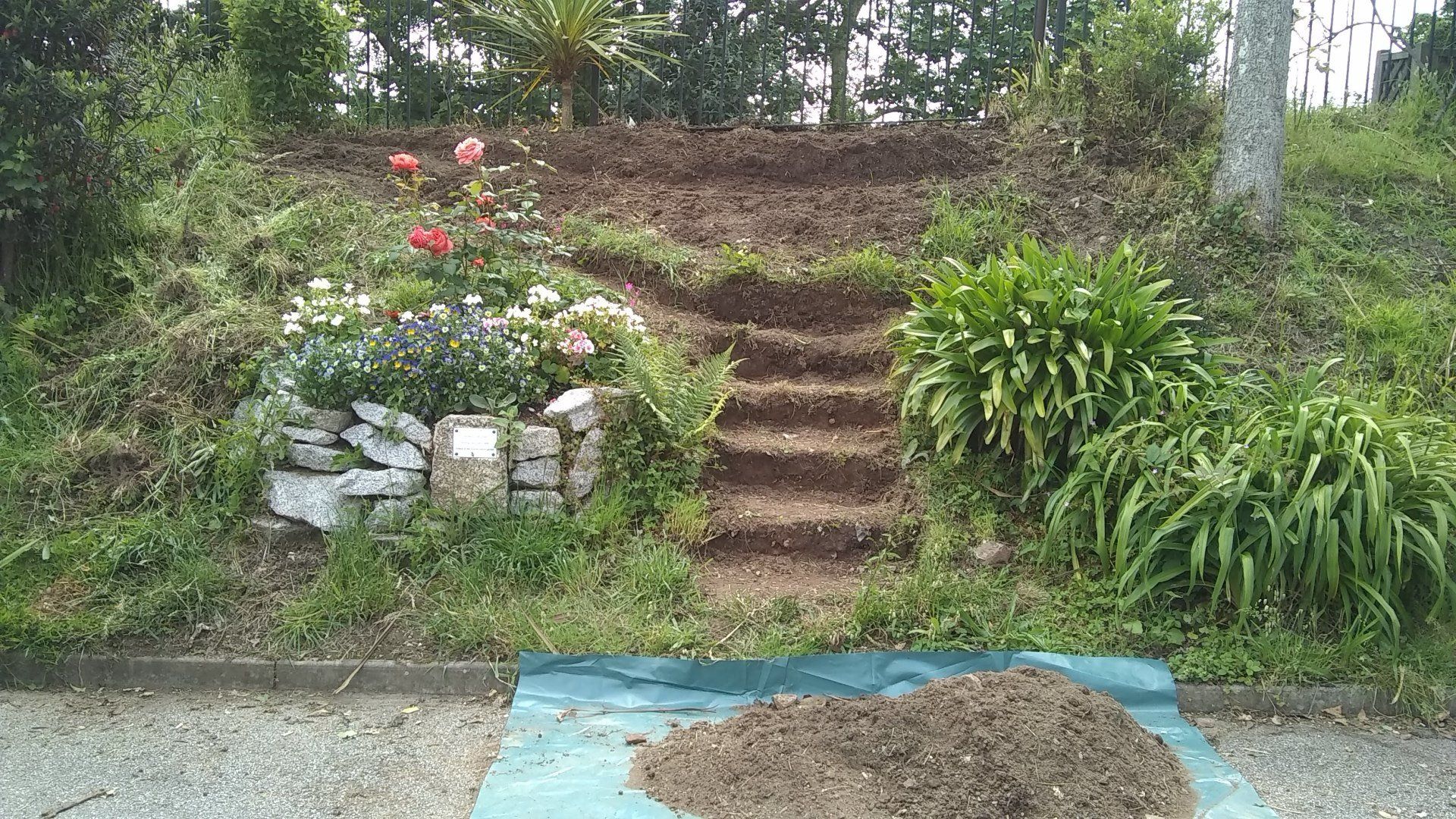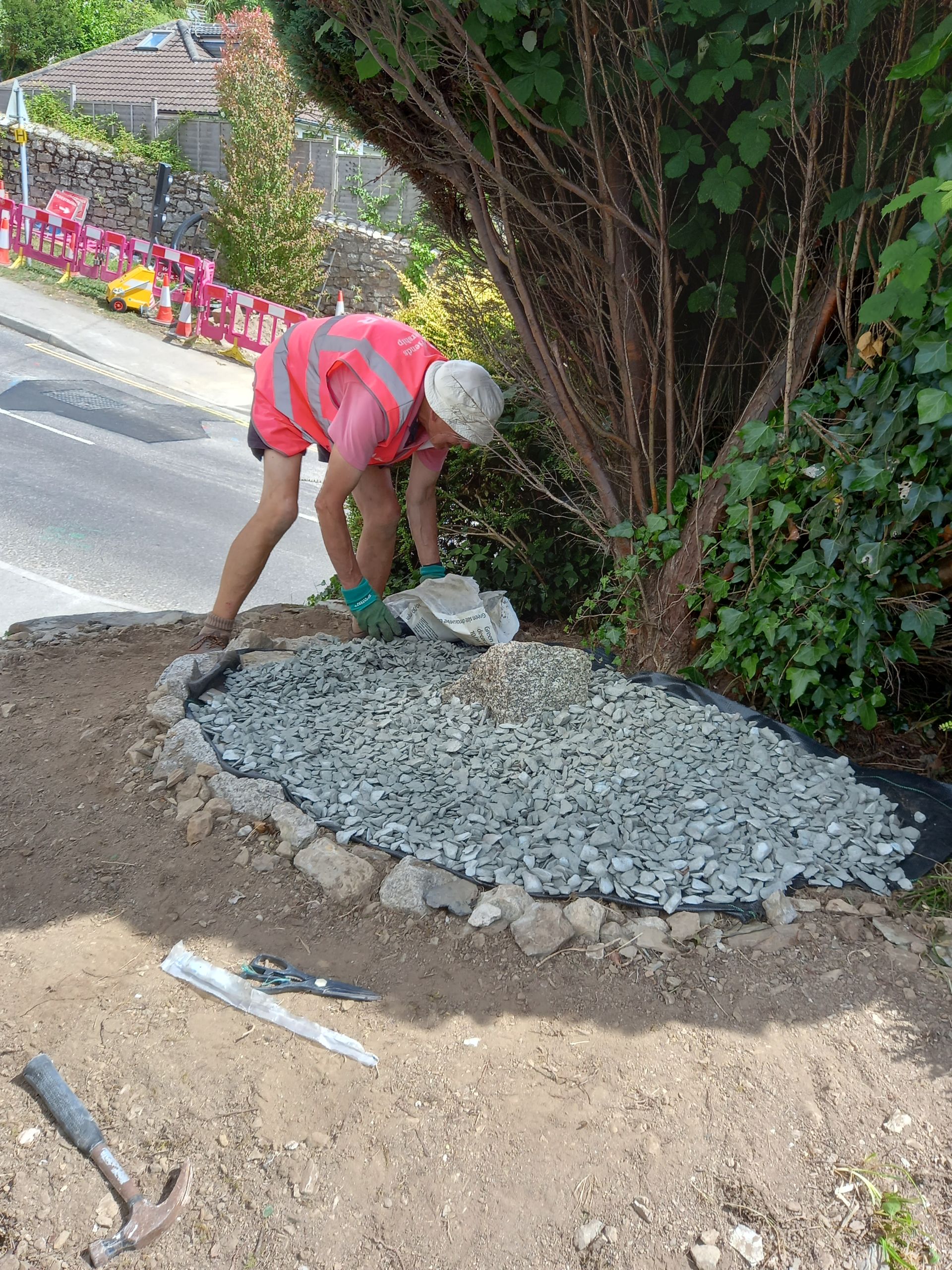 Dan completes the building of our new rockery on the bank, in the carpark.