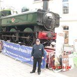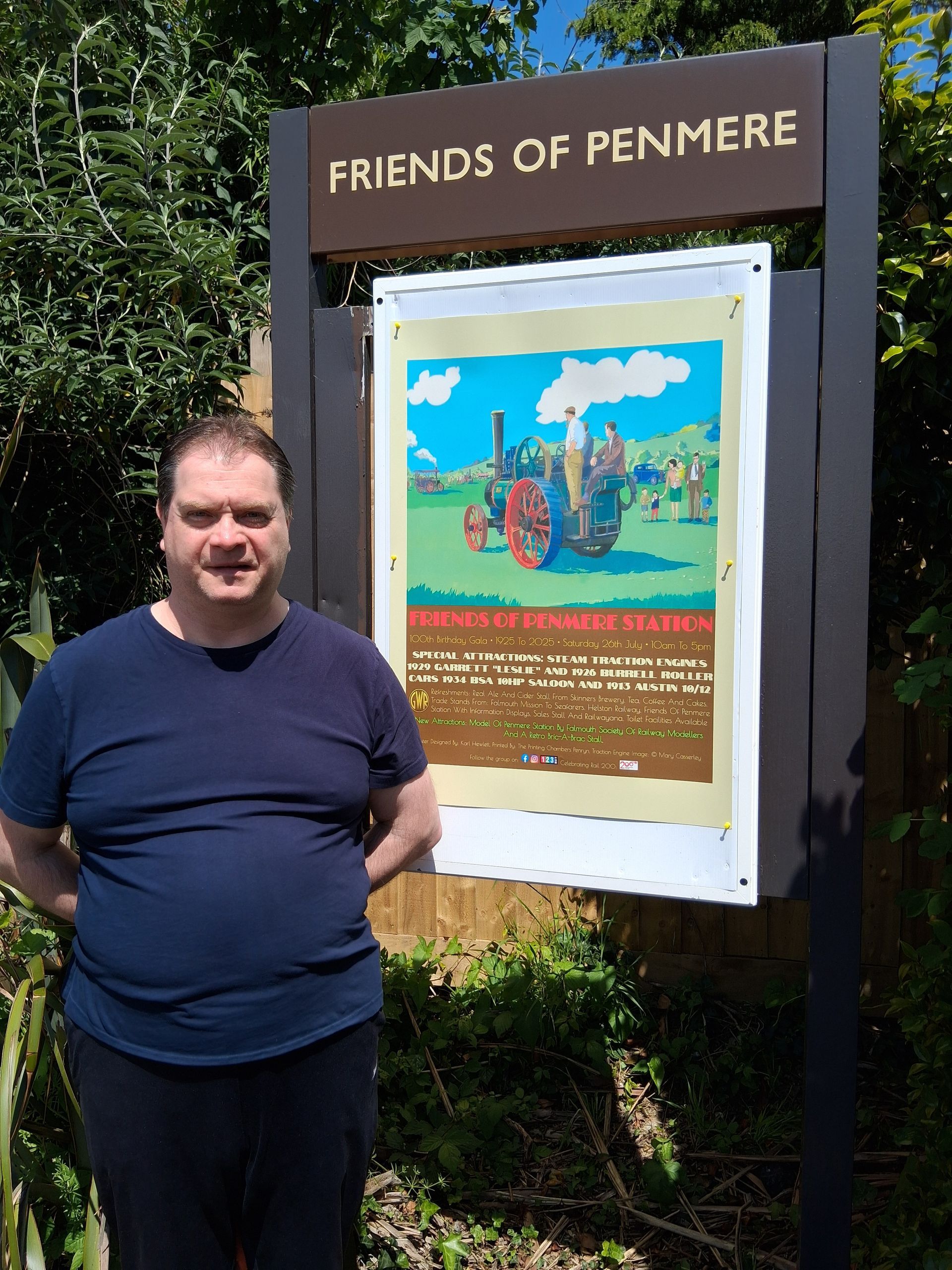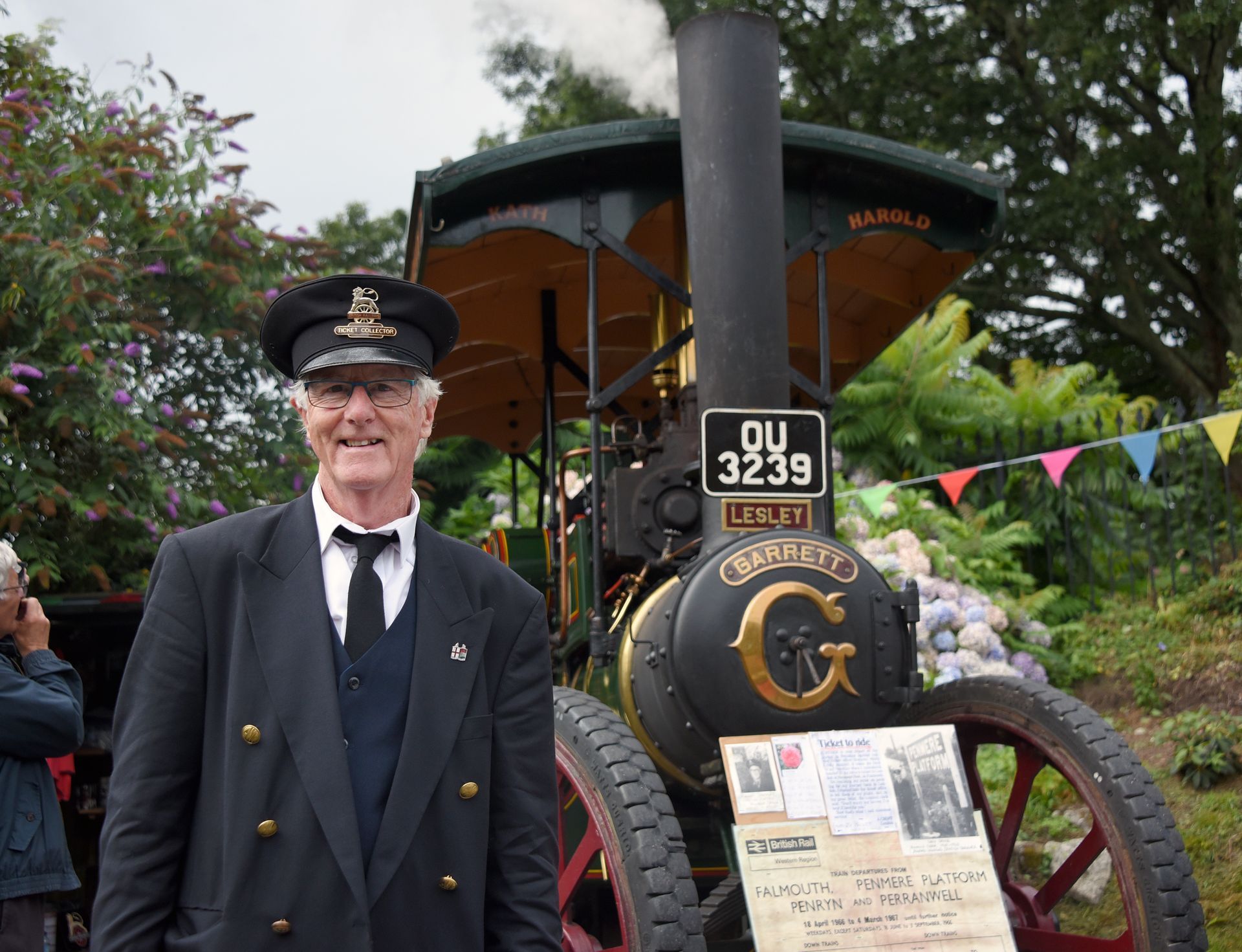 PIC Steve stands proudly in front of "Lesley". The board in front of the engine shows photographs of the last two railwaymen who staffed Penmere, Leonard Grose and Robert Lamport.