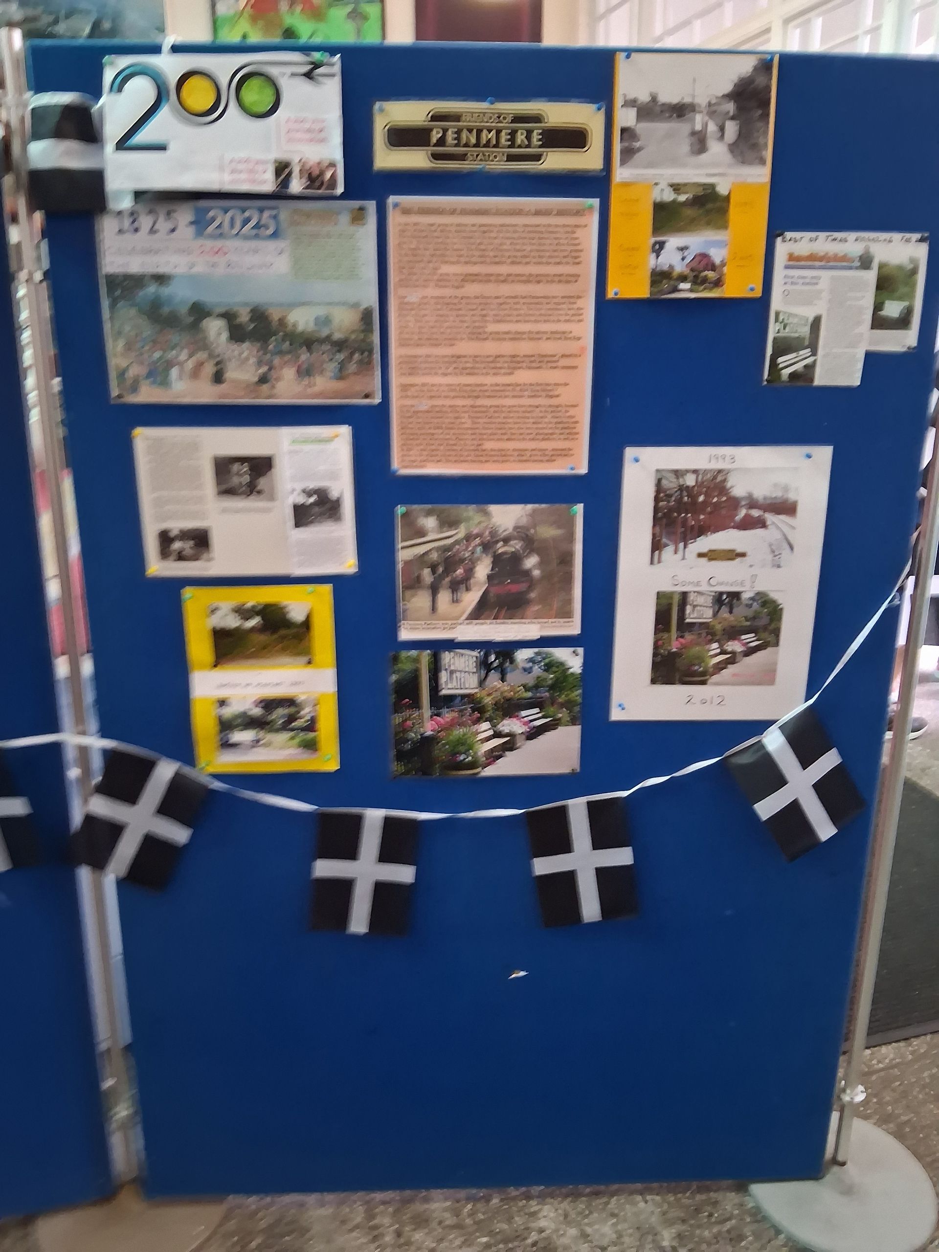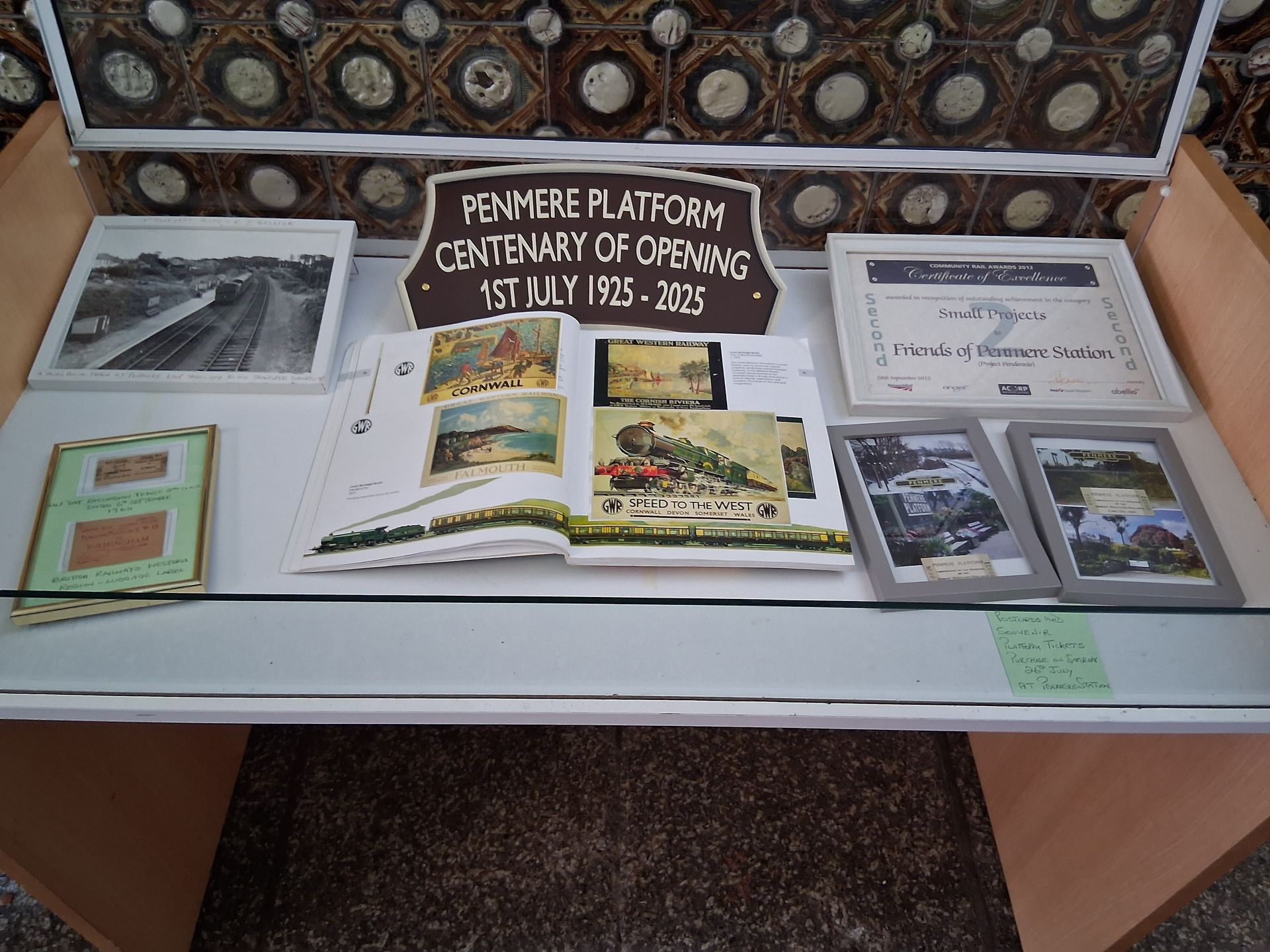 The display cabinet in the foyer of Falmouth Library shows off well the Centenary headboard that will be affixed to our garden engine "Pendennis",and related Penmere Platform and Great Western Railway publication and tickets.