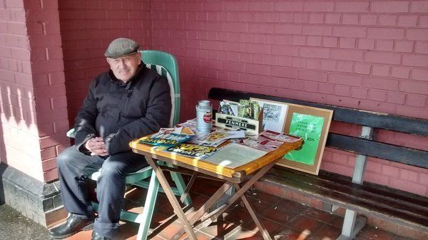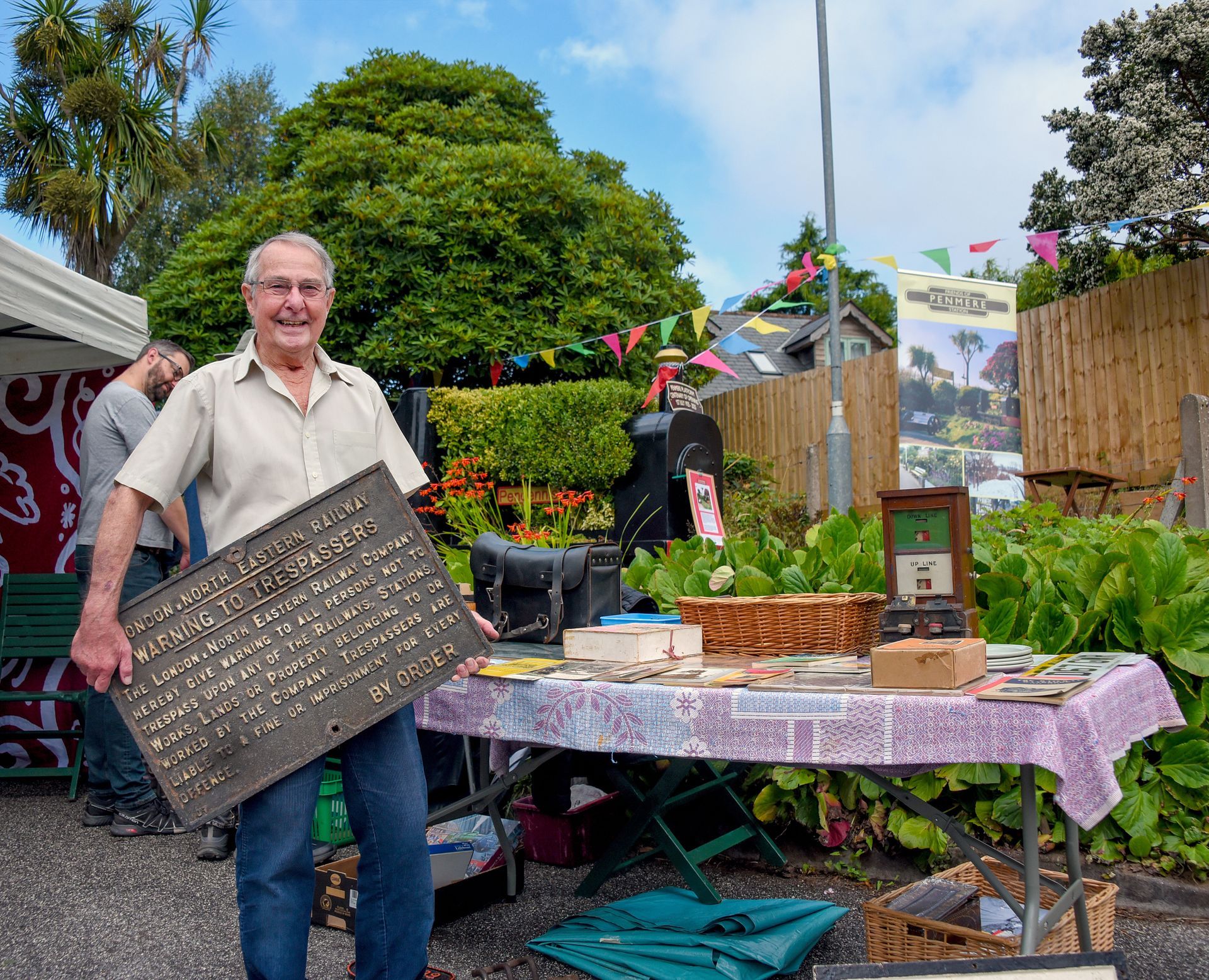 Brian mans his railwayana stand, watched over by a famous train's headboard!