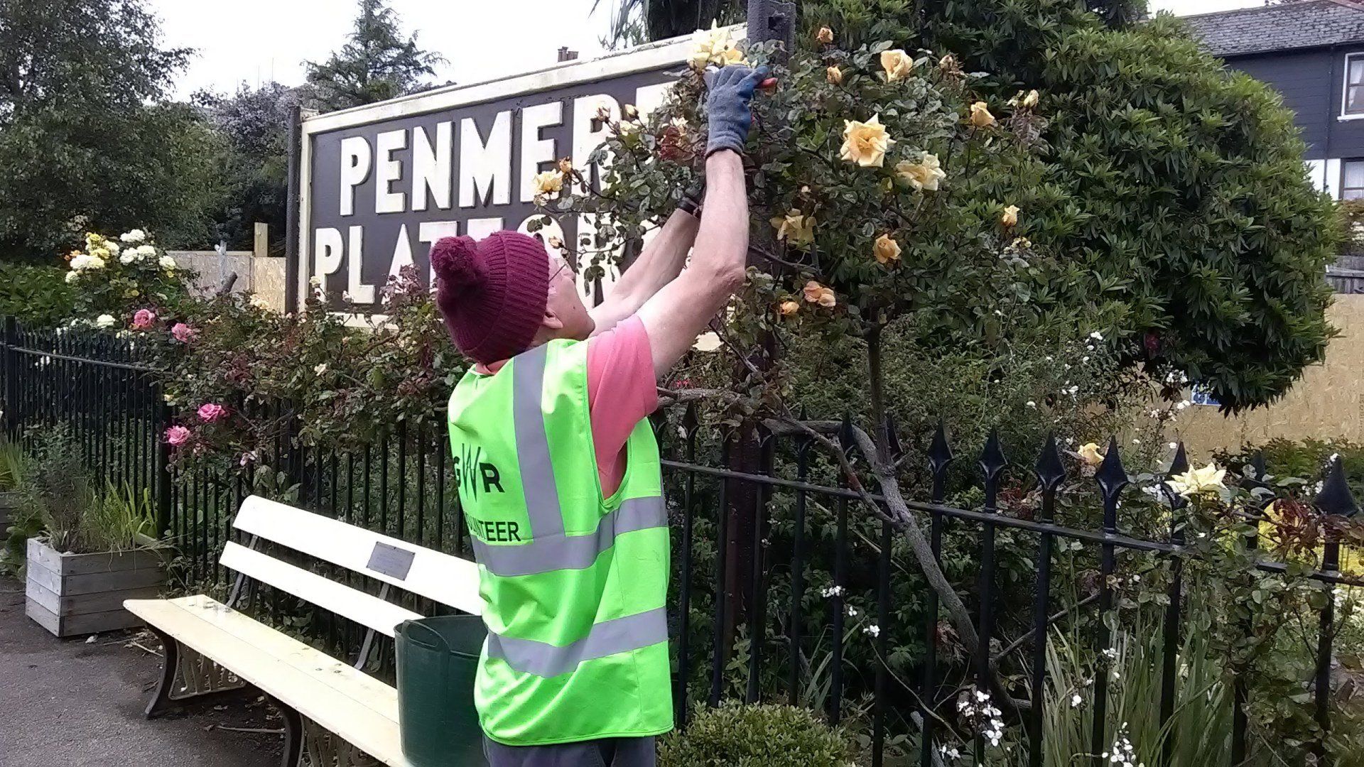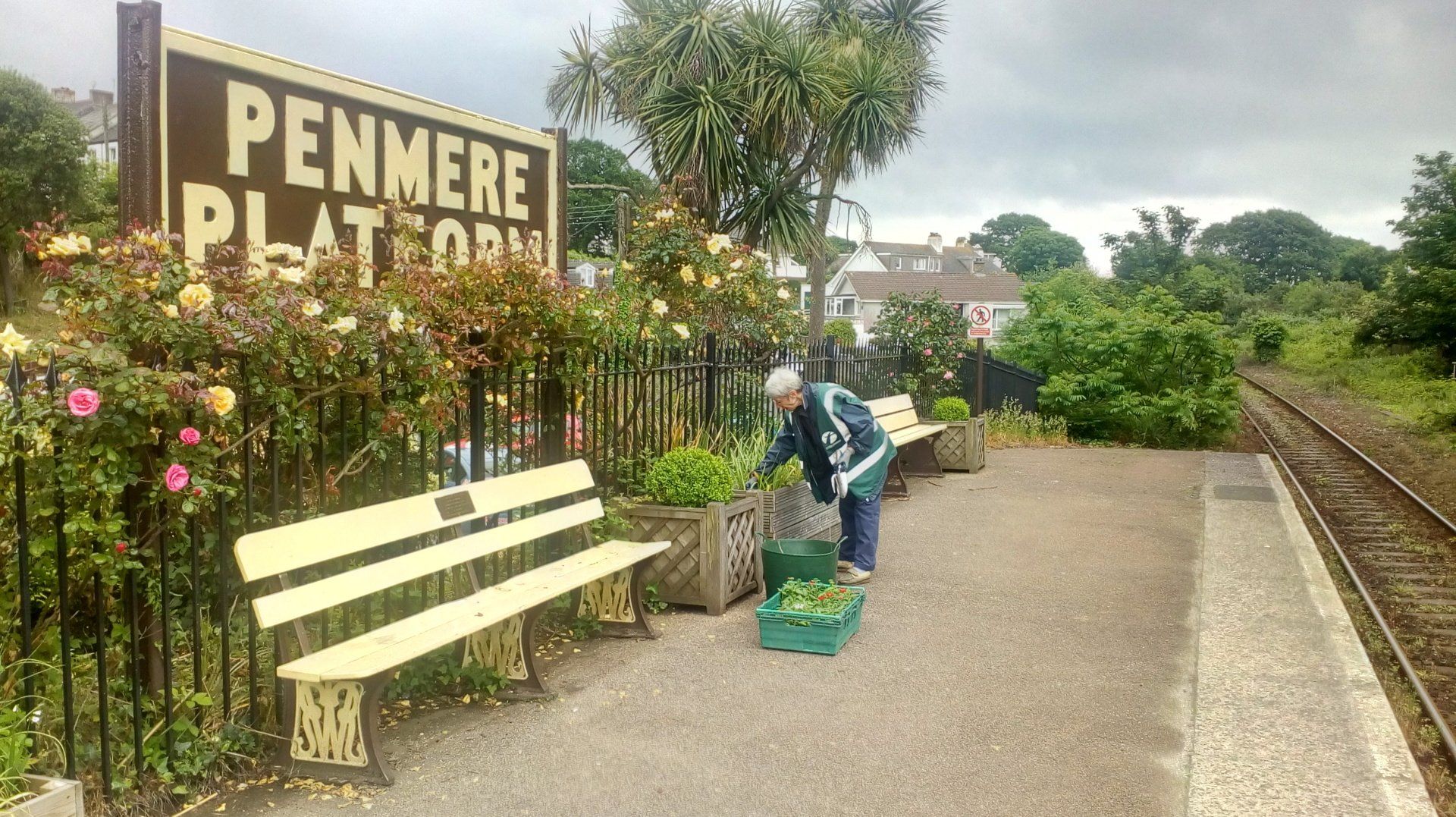 Dave Bishop tending to the yellow roses that surround our "Penmere Platform"running-in board at the Falmouth end.
