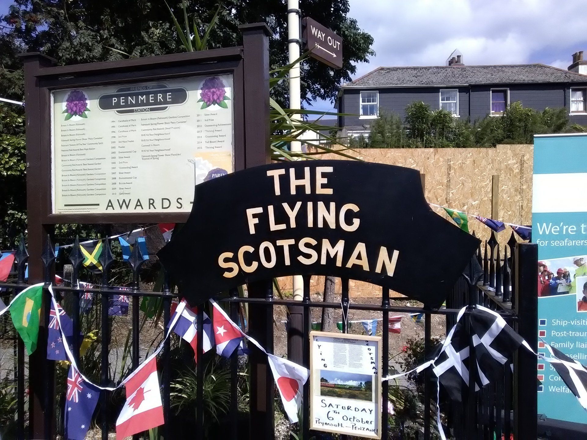 July 2021. Colourful bunting plus a then and now picture placed on seat for Michael Foy, RHS judge to admire! Beneath the Falmouth end running in board.