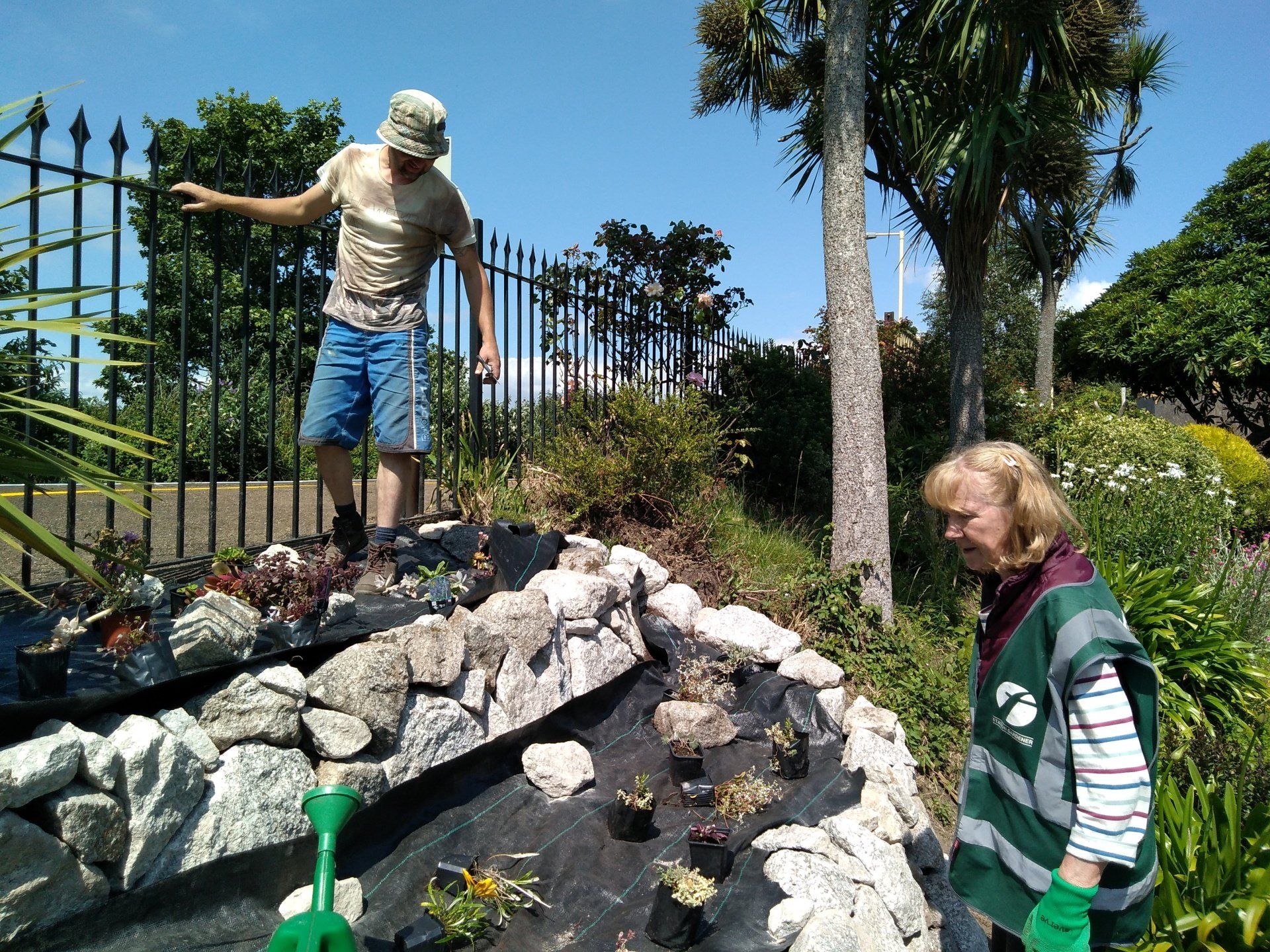 Dave laying out donated green slate stones sponsored by B and Q Penryn at the new station entrance rockery.