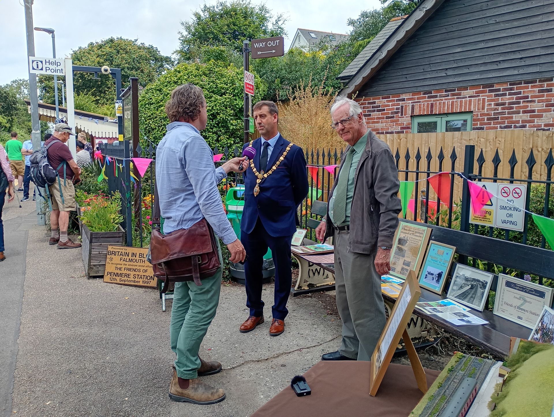 The Deputy Mayor of Falmouth accompanied by Steve Lloyd, Honorary Chairman of the "Friends", officially opens the celebration festivities on the platform.