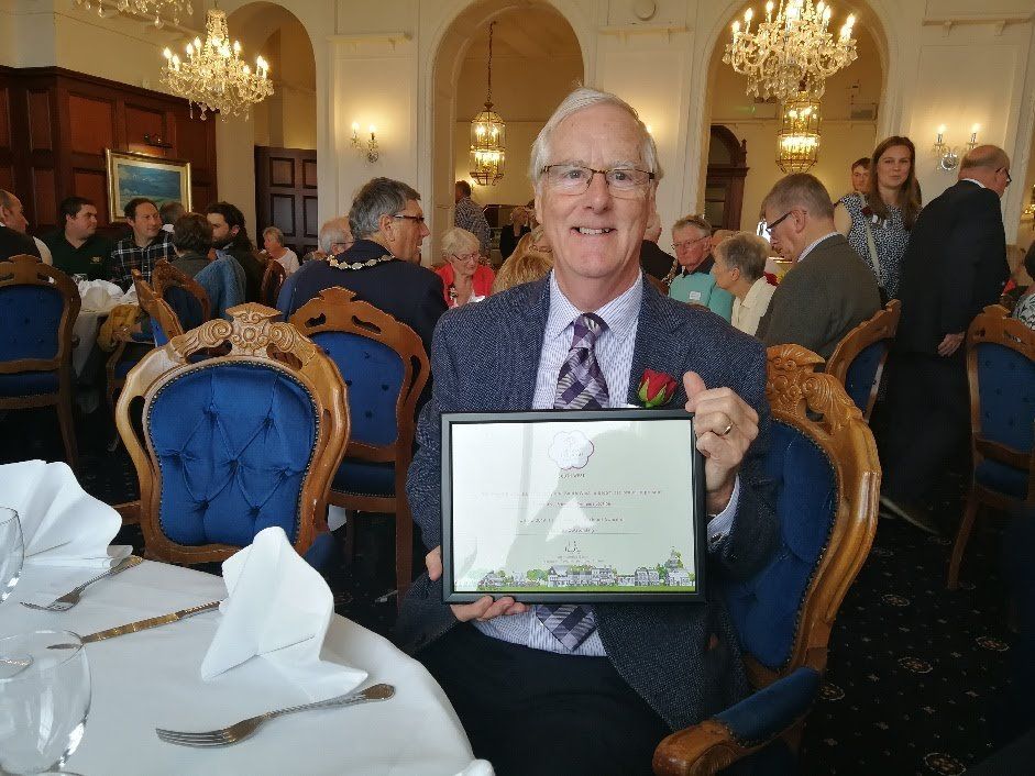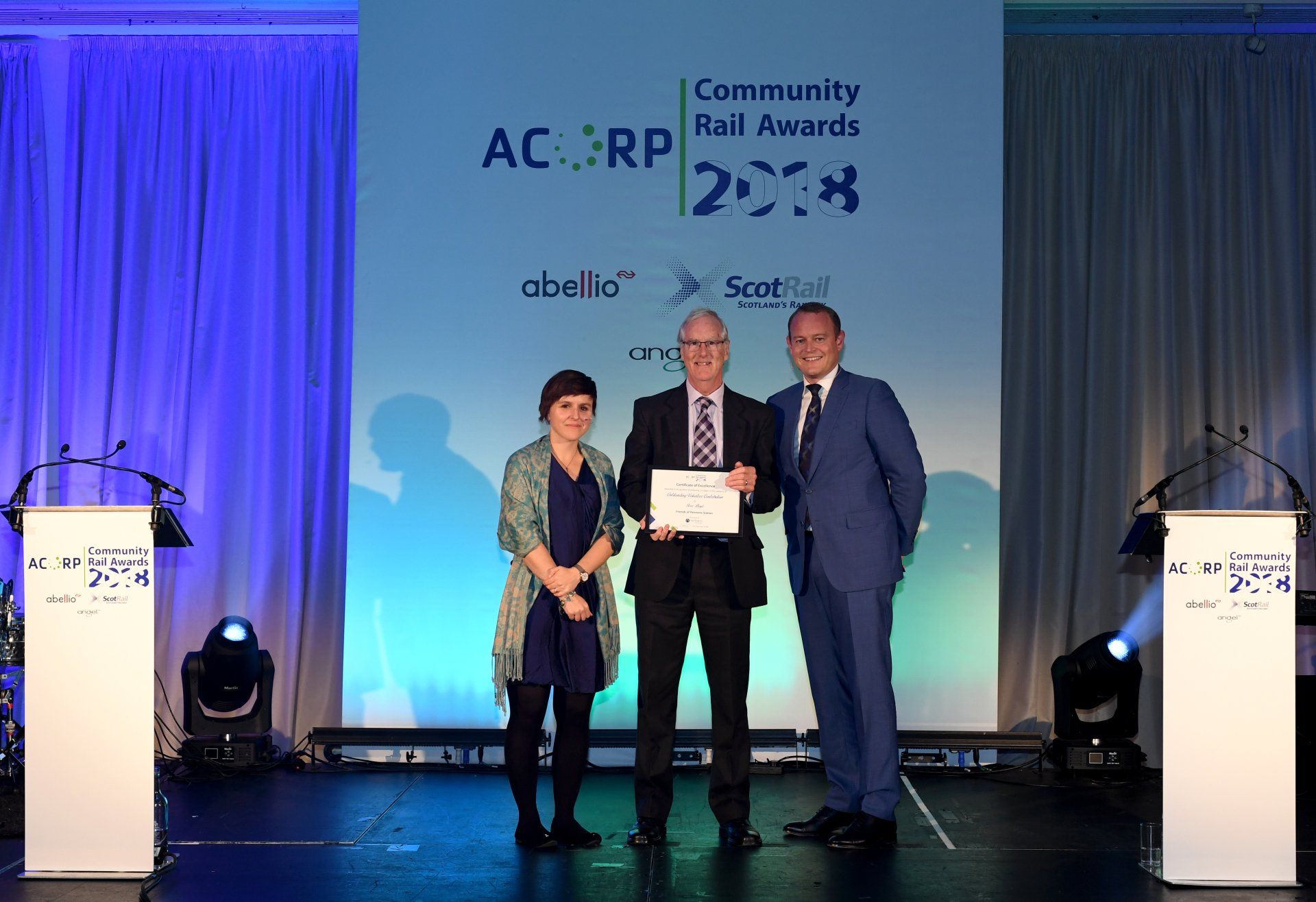 Steve Lloyd, Honorary Chairman of "The Friends" receives a certificate, for coming third in The Outstanding Volunteer category in the 2018 Community Awards held in Glasgow. These awards are held annually by the Association of Community Rail Partnerships. Steve was nominated by Richard Burningham, Manager of The Devon and Cornwall Rail Partnership, after leading the team for 25 years.
